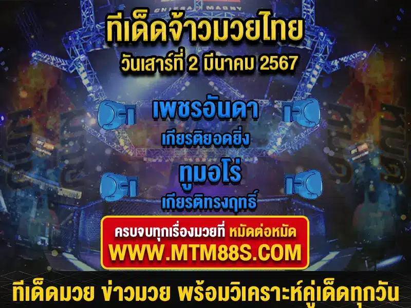 ทีเด็ดมวยวันนี้ มวยวันเสาร์ที่ 02 มีนาคม 2567 ศึกจ้าวมวยไทย เริ่ม 12.15 น. รับชมได้ทางช่อง 3HD กด 33