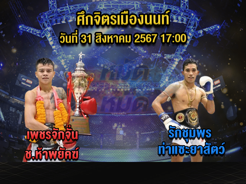 ศึกจิตรเมืองนนท์ เริ่มเวลา 17.00 น. ทีเด็ดมวย ทีเด็ดมวยไทยแม่นๆวันนี้ เพชรจักจั่น ช.ห้าพยัคฆ์ มวยซ้ายจังหวะฝีมือครบเครื่องนิ่งดักสาดแข้งไล่แขนแทงเข่ากดตีหลักเหลี่ยมดี พบ รักชุมพร ท่าแซะยาสัตว์ มวยซ้ายฝีมือครบเครื่องสาดแข้งนำปล้ำตีแข็งแกร่งหมัดศอกแรงเหลี่ยมเชิงดี