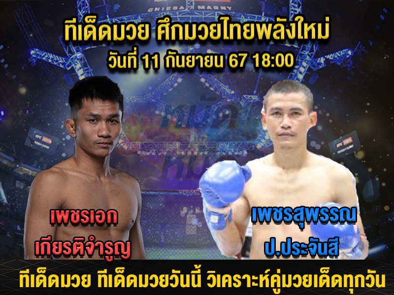 ศึกมวยไทยพลังใหม่ เริ่มเวลา 18.00 น. ทีเด็ดมวย ทีเด็ดมวยไทยแม่นๆวันนี้ เพชรเอก เกียรติจำรูญ มวยขวาเข่าในเหนียวสาดแข้งรุนแรงขวางหน้าแทงปลายแข็งแกร่งกว่า พบ เพชรสุพรรณ ป.ประจันสี มวยจังหวะฝีมือครบเครื่องแข้งซ้ายหนักแรงเหลี่ยมเข่าดีหมัดศอกแรงรวดเร็วกว่า ”เสือยิ้มยาก”