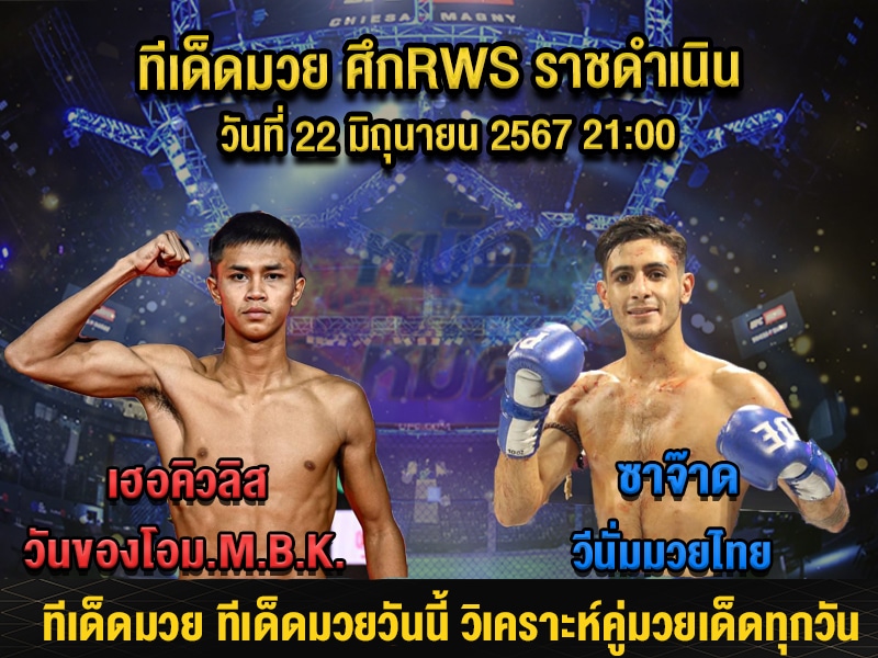 ศึกRWS ราชดำเนิน เริ่มเวลา 21:00 น. ทีเด็ดมวย ทีเด็ดมวยไทยแม่นๆวันนี้ เฮอคิวลิส วันของโอม.M.B.K. มวยเข่าพันธุ์ดุเปิดเกมตลอดปล้ำฟัดรัดตีแข็งแกร่งเดินติดๆดีปลายแรง ปะทะ ซาจ๊าด วีนั่มมวยไทย มวยซ้ายสูงยาวฝีมือครบเครื่องเตะซ้ายแรงวงในไล่แขนสู้หนักแรงทุกลูกเข้าก่อนลุ้นก่อน