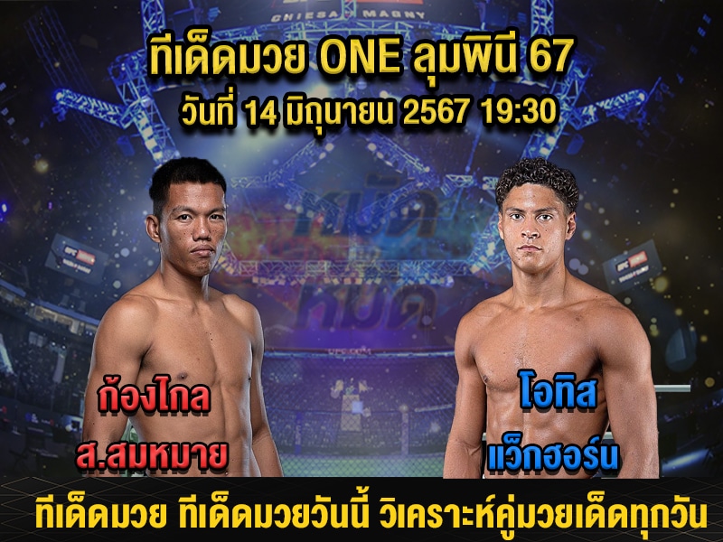 ONE ลุมพินี 67 เริ่มเวลา 19:30 น ทีเด็ดมวย ทีเด็ดมวยไทยแม่นๆวันนี้ ก้องไกล ส.สมหมาย มวยซ้ายจากวังทองฝีมือครบเครื่องกล้าแลกกล้าปะทะหนักแรงทุกลูก โอทิส แว็กฮอร์น เจ้าของสถิติชกอาชีพไร้พ่าย 7 ไฟต์ ในกติกามวยไทย