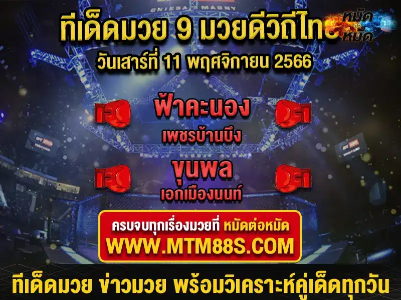 ทีเด็ดมวยวันนี้ มวยวันเสาร์ 11 พ.ย. 66 ศึก ๙ มวยดีวิถีไทย จิตรเมืองนนท์ เริ่ม 15.00 น. ช่อง 9MCOTHD กด30 Facebook ยูทูป ค่ายมวยจิตรเมืองนนท์