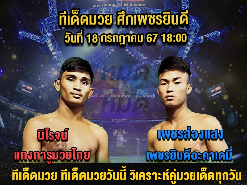ศึกเพชรยินดี เริ่มเวลา 18:00 น. ทีเด็ดมวย ทีเด็ดมวยไทยแม่นๆวันนี้ นิโรจน์ แกงการูมวยไทย มวยเข่ามวยขวาบู๊ดุดันแข้งขวาสาดโต้แรงขวางหน้าบีดุดันปลายแข็งแกร่งกว่า พบ เพชรส่องแสง เพชรยินดีอะคาเดมี่ มวยขวาจังหวะฝีมือครบเครื่องเตะตั้งขวางคาวงในปล้ำตีแทงแรงบู๊ดุดันเคยชนะมา