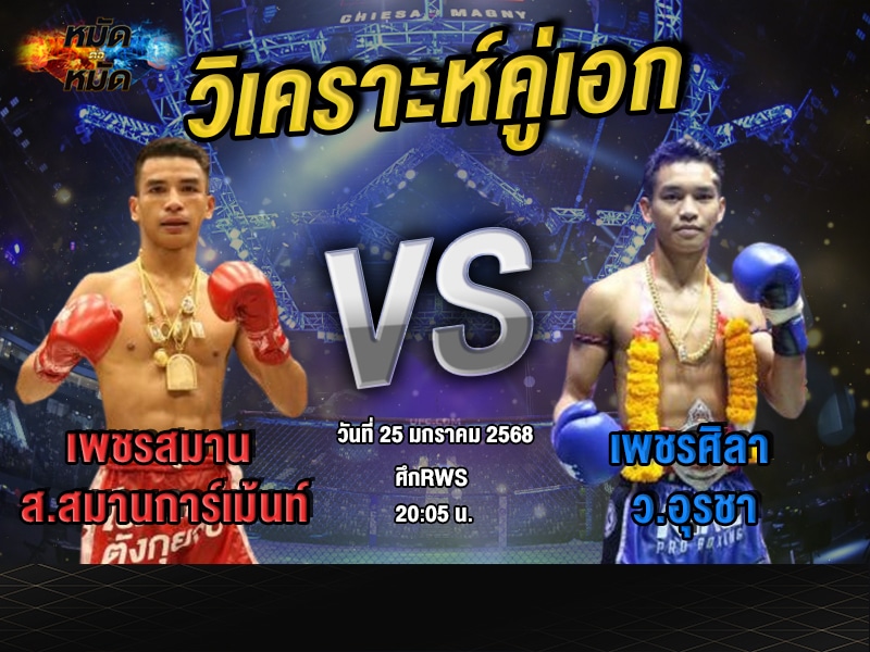 เพชรสมาน ส.สมานการ์เม้นท์ มวยซ้ายฝีมือครบเครื่องอาวุธหนักแรงปล้ำในเหนียวแน่นหมัดศอกแรงเหลี่ยมเชิงดี ปะทะ เพชรศิลา ว.อุรชา มวยซ้ายฝีมือครบเครื่องเตะซ้ายต่อยซ้ายเข่าในเหนียวไล่แขนฟันศอกแรงเหลี่ยมหักแทงดี