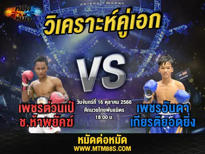 วิเคราะห์มวยวันนี้ คู่เอก ศึกมวยไทยพันธมิตร วันจันทร์ที่ 16 ตุลาคม 2566 เพชรต่วนเป๋ ช.ห้าพยัคฆ์ ปะทะ เพชรอันดา เกียรติยอดยิ่ง เวลา 18.00 น.