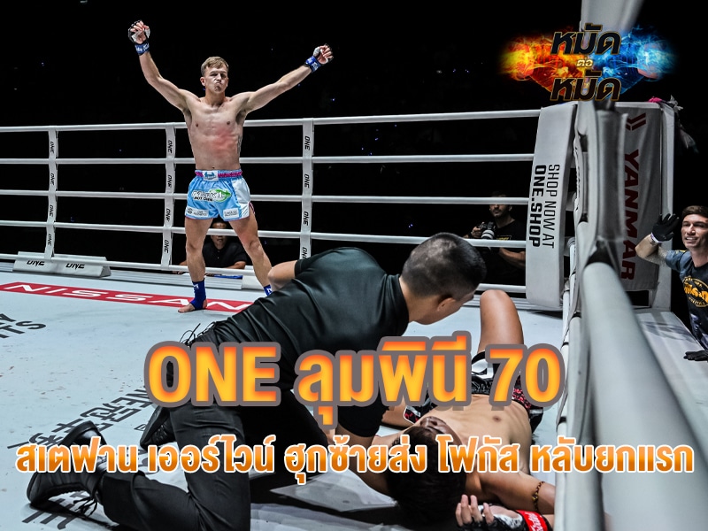 คู่เอกนำรายการ ONE ลุมพินี 70 ในไฟต์นี้จบรวดเร็วเกินคาดเมื่อ สเตฟาน เออร์ไวน์ ที่แบกน้ำหนักสู้ 2.2 ปอนด์ ใช้เวลาเพียง 1:57 นาที ของยกแรกกดฮุกซ้ายเข้าเต็มกรามส่ง โฟกัส ร่วงหลับแบบไม่ทันตั้งตัวชนิดที่แทบยังไม่ได้ออกอาวุธอะไรเลย